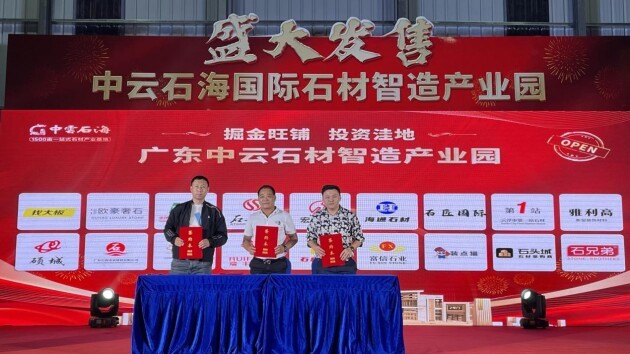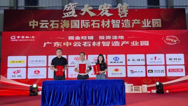 遥遥领先!非凡“智造”!石都倾力之大项目——中云石海闪耀世界,董事长关海棠与入驻企业云浮市雅利高新型装饰、肇庆市石兄弟石材新材料、云浮市寶豐雲石、福建省大狮子矿业现场签约。