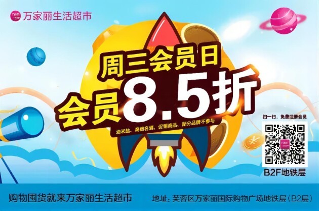 开学囤货正当时,超值优惠就等你来!万家丽生活超市,每周三会员享全场8.5折(油米盐、高档名酒、特价商品不参与),消费满额尊享免费停车,更有不定期好礼相送,更多心动好礼尽在万家丽生活超市!