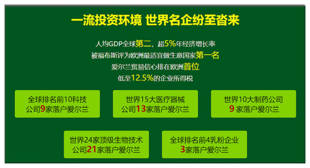 当然,爱尔兰还有非常有竞争力的低税收的制度,爱尔兰的企业所得税是12.5%,是欧洲国家里面公司税最低的国家之一。同时爱尔兰跟很多国家都有双边税务的协定,也包括我们中国。爱尔兰政府最新发布的财政预算案里,政府非常明确的表达了12.5%的企业所得税是爱尔兰的基本国策,不会有任何的变动。