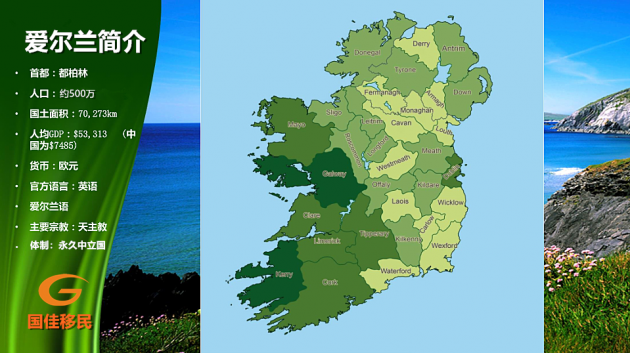 爱尔兰也能够迎合这样的需求:首先,它地处西欧,西临大西洋,与英国隔海相望,是北美通向欧洲的通道。爱尔兰自然环境保持得相当好,素有“翡翠岛国”之称,全国绿树成荫,河流纵横,社会文明程度高,绝对是大展宏图首选之地。