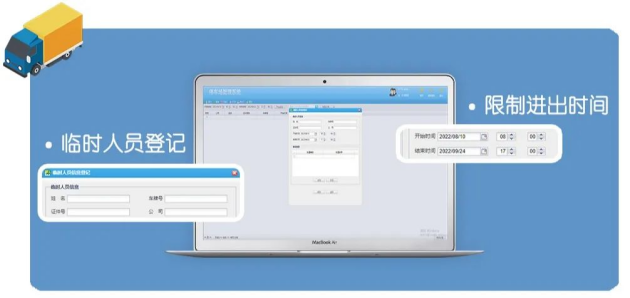 针对无权进入园区的临时车,系统可快速登记其车辆及驾驶人信息,并设置车辆停留时间段,为其开放车道授权。