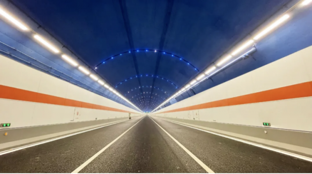 在隧道内,通过大规模应用反射式发光技术及陶瓷散热隧道灯,营造出高品质、高水平、舒适、节能的隧道照明环境。
