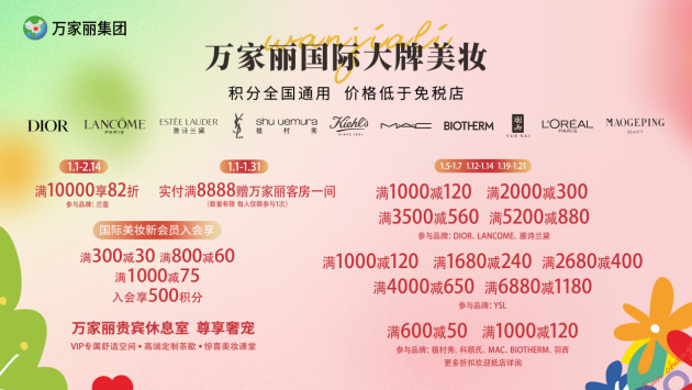 万家丽国际大牌美妆新春臻献,1月12日至1月14日,1月19日至1月21日,DIOR、LANCOME、雅诗兰黛,满1000减120 ,满2000减300,满3500减560,满5000减850;YSL满100减120,满1680减240,满2680减400,满4000减650,满6880减1180。植村秀、科颜氏、MAC、Biotherm、羽西,满600减50,满1000减120,欧莱雅、毛戈平、林清轩、珀莱雅抵店更有超多满额买赠惊喜等着你!1月1日至2月14日满10000享82折,(参与品牌:兰蔻),1月1日至1月31日实付8888增万家丽客房一间(数量有限,每人仅限参与一次)。
