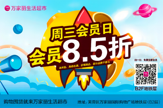 国庆假期购物囤货,就来万家丽生活超市。万家丽生活超市每周三会员享全场8.5折(油米盐、高档名酒、特价商品不参与),地铁2、5号线直达卖场,且消费满额尊享免费停车,更有不定期好礼相送。