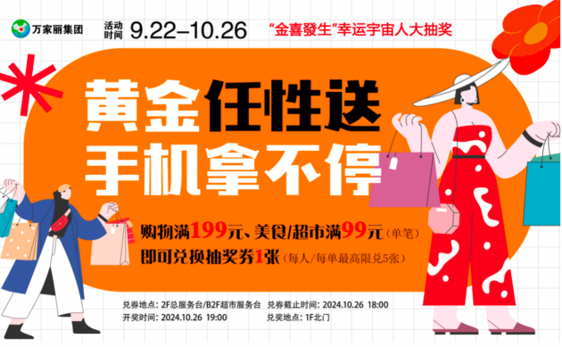 金秋放肆嗨,幸运抽大奖。9月22日至10月26日,“十全十美”幸运宇宙人大抽奖惊喜来袭,在万家丽国际MALL全场购物单笔消费满199元/美食满99元,即可至2楼服务台兑换抽奖券;在超市消费满99元,即可至B2F超市服务台兑换抽奖券。10月26日19:00将开出大奖,黄金饰品、华为手机、酒店客房券、超市购物卡、百元无门槛美食券等多种豪礼惊喜奉上,更有新会员精美礼包、三轮现金红包雨等丰富惊喜享不停。更多活动详情请关注“宇宙中心万家丽”微信公众号!