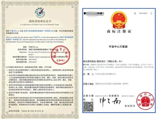 ▲“宇宙中心万家丽”国际顶级域名证书和商标注册证