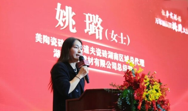 美陶瓷砖&华尔道夫瓷砖湖南区域总代理、湖南夯程建材有限公司总经理姚璐女士发言表示,选择大于努力,思路决定出路!作为在万家丽经营二十二年的老商户,非常荣幸能代表建材家具的品牌商上台发言。跟对人,做对事很重要,二十多年前我爱人跟舅舅还在万家丽这边管仓库,接触了很多品牌大亨,于是想着自己创业。2002年万家丽开放招商,我们毫不犹豫抢先入驻,2004年美陶瓷砖品牌诞生,我们争取到了湖南区域总代理,这一做就是22年,我们从最开始的四五十平方做到现在的三百多平,光靠自然客流就能日入几十万,小区项目总面积加起来过百万方,销售业绩连续多年破千万。2013年我们趁热打铁自创华尔道夫品牌,现如今全国覆盖四十多家店。从白手起家到硕果累累,所有的成功都是基于站在万家丽这个稳定平台,当然也离不开黄董的指导与加持,黄董曾说过,永远要把自己的品牌当成新的品牌去做,保持创业的初心与热情,任何生意都好做。如今是自媒体时代,我们也将紧跟市场脚步,努力打通线上渠道,高质量引流获客。平台稳定,品牌才能长远,平台优质,品牌才能腾飞,无数商户已在万家丽实现了家族赓续、二代传承,我希望我的下一代也能在万家丽这艘巨轮上延续我们的辉煌,再创一番事业新高。我始终坚信,在湘商翘楚黄董的指导下,我们的未来会越来越好。