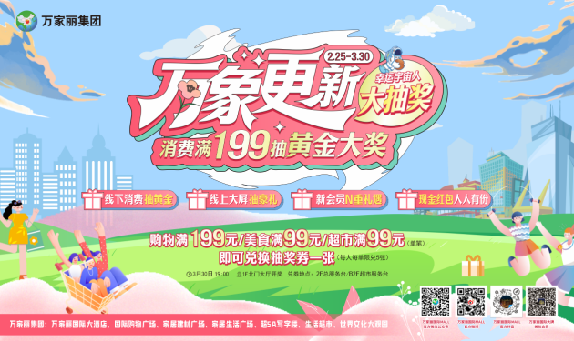 2月26日至3月30日,“万象更新”幸运宇宙人大抽奖来袭,在万家丽国际购物广场全场单笔消费满199元,美食类单笔消费满99元,万家丽生活超市消费满99元,均有机会赢取黄金饰品、品牌手机、超市购物卡、豪华客房体验券、大牌美食券,3月30 日活动当天,加入万家丽粉丝群并关注微信公众号或注册万家丽美妆会员还有现金红包雨、大牌美食券等惊喜福利等着你。更多活动详情请关注“万家丽国际MALL”微信公众号!