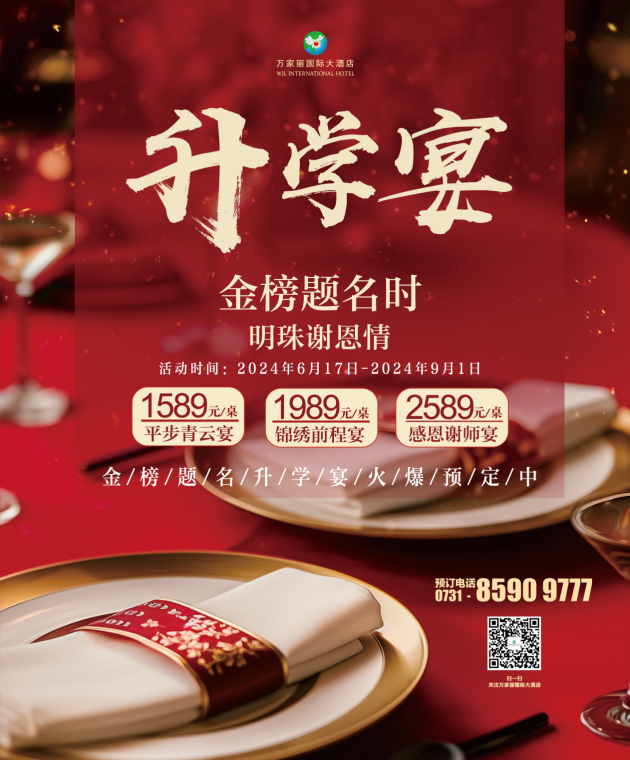 礼遇不停,相约万家丽国际大酒店,共赴青春之约!2024年6月17日至2024年9月1日,万福中餐厅倾心推出,升学宴、谢师宴、毕业宴,礼遇多多,宴遇前程!万福中餐厅位于 26 层,可将星城繁华美景一览无余,共设有 28 个风格独特的包厢,融汇了八大菜系精髓,坚持使用高端食材,并由著名大厨烹饪顶级美食佳肴,由一流大厨团队精心搭配升学宴主题菜单 ,一勺一筷于舌尖遇见未来。(尊享热线:0731-85909777 、 0731-85909776)