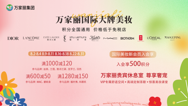 七夕甄献,浪漫一夏!万家丽国际大牌美妆价格低于免税店,全国积分统一通用。8月2日至8月4日,8月16日至8月18日;迪奥、兰蔻、雅诗兰黛、YSL、羽西满1000减120;植村秀、科颜氏满1280减150;MAC、碧欧泉,满600减50,羽西满1000减120。更多七夕浪漫福利等您到店解锁!不仅如此会员奢享福利限时放送,七夕节特别礼赠,8月10日当天顾客购物实付满1777元,即可赠送费列罗或德芙巧克力一盒,8月9日至8月11日,顾客购物实付满2777元,赠送电影票两张(数量有限,先到先得)