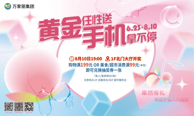 果然有礼·幸运宇宙人大抽奖,6月23日至8月10日,在万家丽国际购物广场全场单笔消费满199元,美食类单笔消费满99元,万家丽生活超市消费满99元,均有机会赢取黄金饰品、品牌手机、超市购物卡、豪华客房体验券、大牌美食券,8月 10日活动当天,加入万家丽粉丝群并关注微信公众号或注册万家丽美妆会员还有现金红包雨、大牌美食券等惊喜福利等着你,更多活动详情请关注“宇宙中心万家丽”微信公众号!