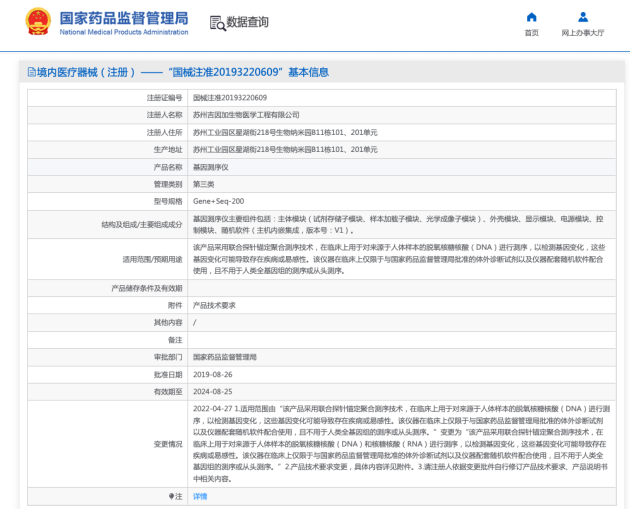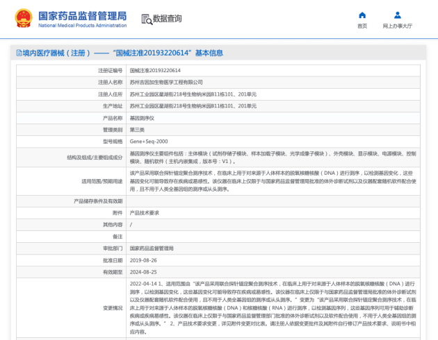 变更后,Gene+Seq-2000和Gene+Seq-200基因测序仪适用范围包括“在临床上用于对来源于人体样本的脱氧核糖核酸(DNA)和核糖核酸(RNA)进行测序”。这意味着,吉因加测序平台不仅可对人体样本的DNA和RNA测序,还可对来源于人体的其他样本进行测序,譬如来源人体的病原DNA和RNA。这一点也区别于市面上多数测序平台仅可检测人的DNA的要求,从而将测序应用场景全面扩展到肿瘤基因检测、病原宏基因组检测、新冠溯源和监测以及遗传病致病基因检测等方向。