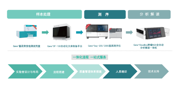 除了此次获批新增适用范围的自主品牌测序仪,以及获批NMPA三类和二类证书的吉因加人EGFR/KRAS/ALK基因突变检测试剂盒、Gene+OncoBox肿瘤NGS全自动分析解读一体机配套软件,公司还精心整合了实验室设计与布局、流程规划、质量管理体系搭建、人员培训、技术支持等全流程运营服务,能全面合规地助力医院端和行业端国产NGS测序平台的稳定运营。