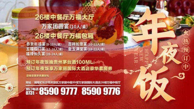 相约万家丽,欢聚团圆宴!万家丽国际大酒店七星设计标准,四星收费,岁末感恩特惠,多款春节年夜饭套餐现已开启火热预定!即刻预订尊享多重福利,免费参与贵州茅台酒、自制梅菜扣肉等豪礼抽奖,每桌赠酒水饮品、果盘餐点和全家福拍立得照片一张。万福中餐厅打造全家齐乐的团聚时光,28个特色包厢及大厅可供选择,用餐环境高雅,为您呈现缤纷美馔。更多详情请来电咨询。