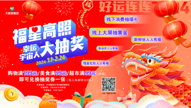 宇宙中心万家丽新春送福第一弹:“福星高照”幸运宇宙人大抽奖,在万家丽国际购物广场全场单笔消费满199元,美食类单笔消费满99元,万家丽生活超市消费满99元,均有机会赢取黄金饰品、品牌手机、超市购物卡、豪华客房体验券、大牌美食券,2月24 日活动当天,加入万家丽粉丝群并关注微信公众号或注册万家丽美妆会员还有现金红包雨、大牌美食券、新春福气礼包等惊喜福利等着你,更多活动详情请关注“万家丽国际MALL”微信公众号!